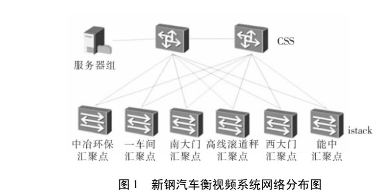 考慮到視頻占用帶寬比較大,不能采用環(huán)網(wǎng)模式,但又需要進(jìn)行鏈路保護(hù),因此新鋼地磅視頻系統(tǒng)采用 CSS( 集群) + iStack( 堆疊) 結(jié)合的技術(shù)進(jìn)行組網(wǎng)。