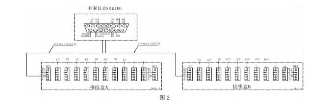 本臺地磅長度大,需用傳感器16只,一般的標準接線盒只能接10只傳感器,因此我們配了兩只接線盒,圖1中A接線盒接入10只稱重傳感器信號和B接線盒接入6只稱重傳感器信號由兩條信號線分別接入稱重控制器的傳感器接口。此接法在計量檢定時秤臺間有較大誤差。
