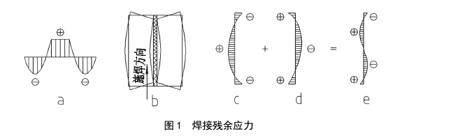 a縱向殘余應(yīng)力;b焊接殘余變形;c橫向殘余應(yīng)力(縱向收縮引起的);d橫向殘余應(yīng)力(橫向收縮引起的);e橫向殘余應(yīng)力總和