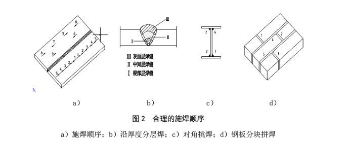 ①采取適當?shù)暮附禹樞蚝头较?,例如為了使每次施焊產(chǎn)生的殘余應(yīng)力和殘余變形有所抵消,應(yīng)盡量采用對稱焊、分段焊、厚度方向分層焊、鋼板分塊拼焊、工字形頂接時采用對角挑焊;為使收縮量或受力較大的焊縫留有伸縮余地,減小殘余變形,先焊收縮量較大的焊縫,后焊收縮量較小的焊縫;先焊受力較大的焊縫,后焊受力較次要的焊縫;鋼板分塊拼接先焊短焊縫,后焊直通長焊縫。圖2中的阿拉伯數(shù)字表示施焊的順序。
