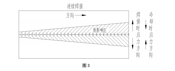 U型梁結(jié)構(gòu)的地磅承載器目前都是采用連續(xù)自動焊接的,正是由于連續(xù)焊接,所以在焊接時“熱影響區(qū)”越來越大,鋼材產(chǎn)生膨脹也大;而冷卻時鋼材產(chǎn)生收縮,內(nèi)部就產(chǎn)生內(nèi)應(yīng)力,給承載器帶來變形的隱患,焊接和冷卻時應(yīng)力方向如圖3所示.