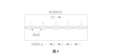 解決方法是采用合理的焊接工藝。我們建議采用“斷續(xù)跳躍法”,即將需要焊接的區(qū)域分為多段(當然這些分段的數(shù)量可以依據(jù)工藝試驗后,進行確定),如圖 4所示。