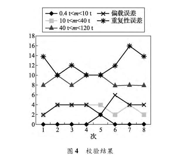 本次汽車衡改造完成后按照國(guó)家檢定規(guī)程對(duì)該汽車衡進(jìn)行檢定,經(jīng)過(guò)計(jì)量確認(rèn)后合格, 完全滿足120 t檢斤車輛計(jì)量能力,并且該汽車衡在運(yùn)行后2月內(nèi)每周對(duì)其計(jì)量性能進(jìn)行校驗(yàn),校驗(yàn)結(jié)果如表1和圖4所示。